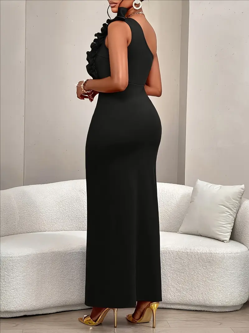 Rochie maxi elegantă cu un umăr, volane și fără mâneci, pentru femei – design asimetric bodycon cu tăietură înaltă, perfectă pentru petreceri, întâlniri și evenimente formale.Rochi Fără Mâneci cu Detalii Asimetrice și Volane .